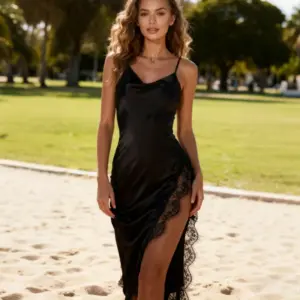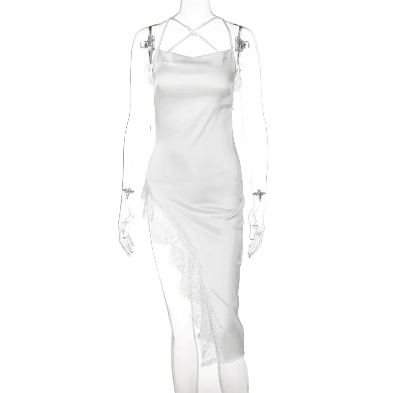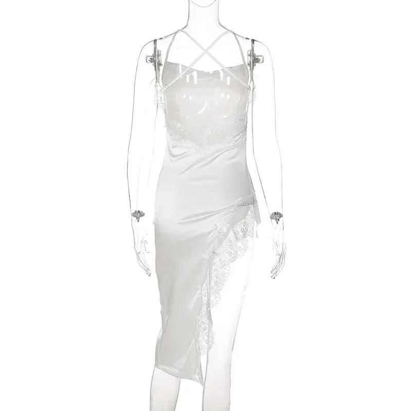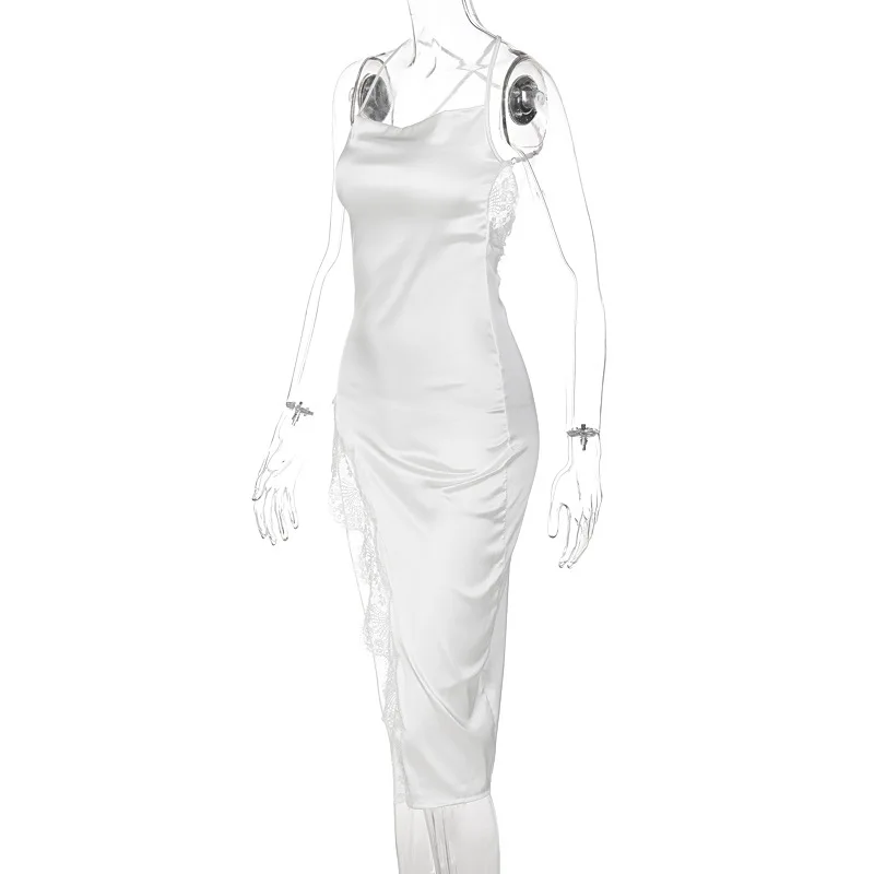 New Fashion Sexy Backless Lace Dress Women High Split Camisole Dresses Elegant Solid Color Spaghetti Strap Bodycon Midi Dress