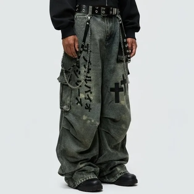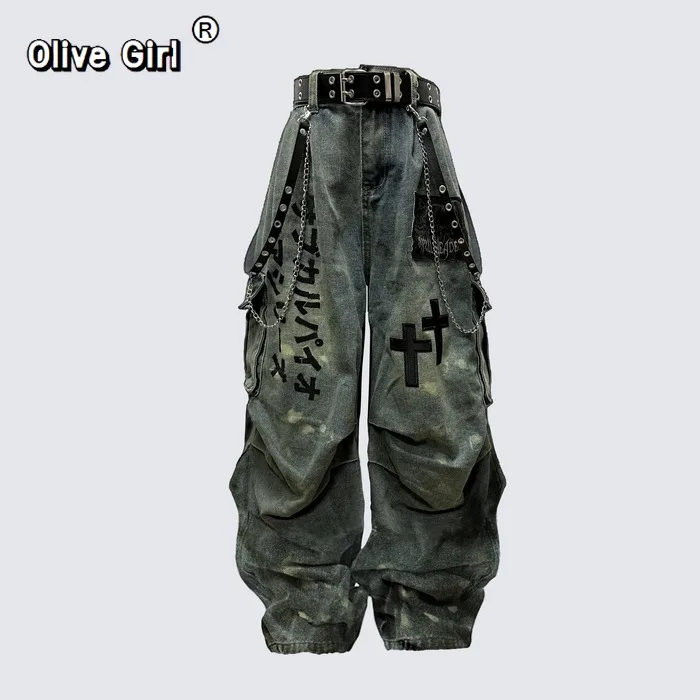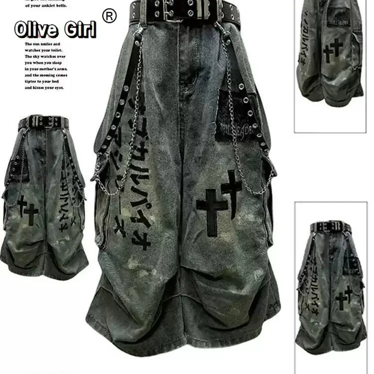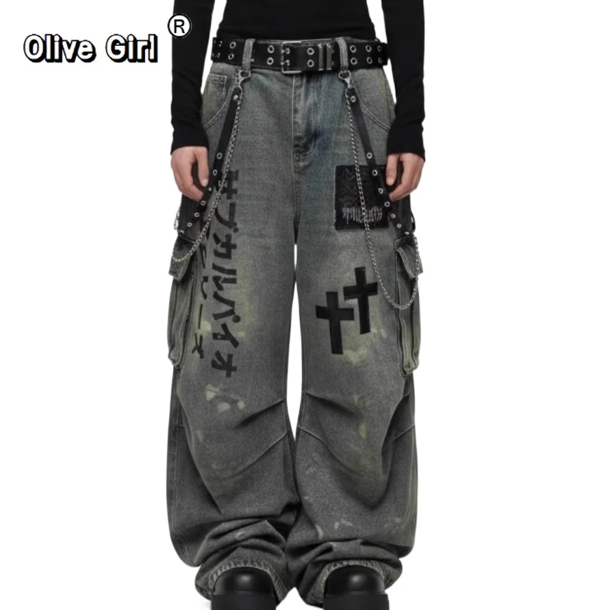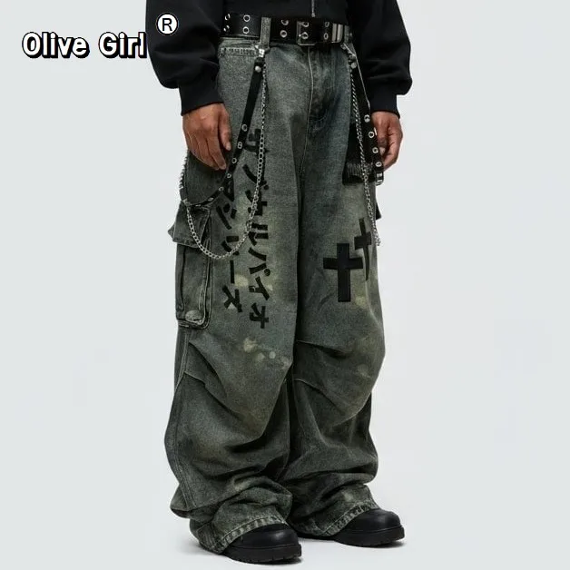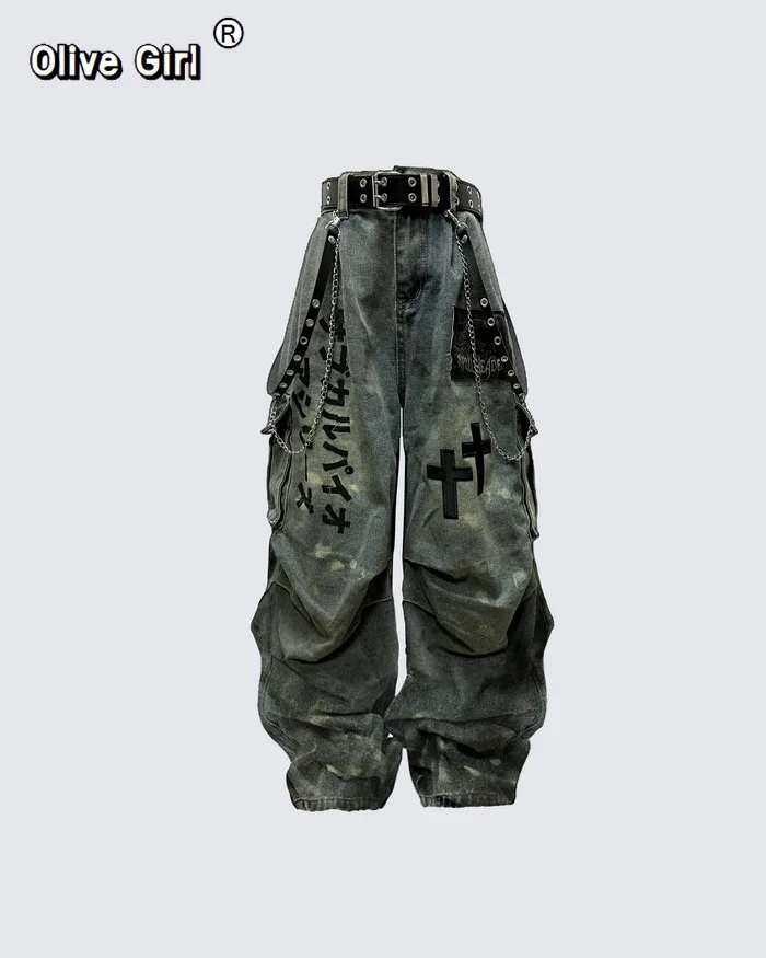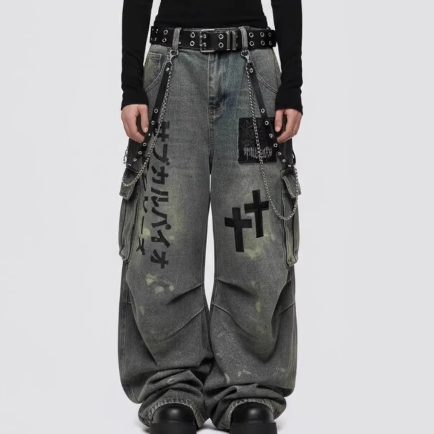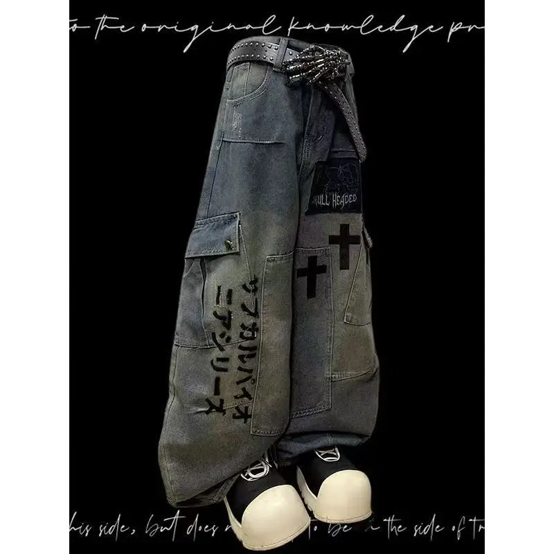 Plus Size Skull Cross Women’s Jeans Trousers Denim Pants American Retro Vibe Wide-legged Dragging Oversized Baggy Pants