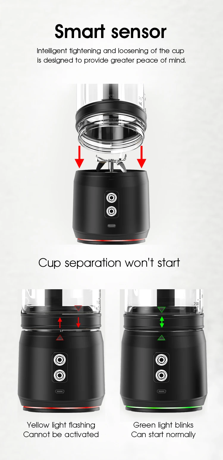 4. The body material is made of food grade PCTG material, intelligent sensor design, the sensor will not be activated in case of cup loosening and separation.the bottom of the led light bar display.red light is not startable, green light is startable.safe and secure, product integration base, blender base non-slip coaster design, shock absorption and noise reduction soft rubber placement, waterproof performance excellence is guaranteed, do not worry about water caused by short circuit!