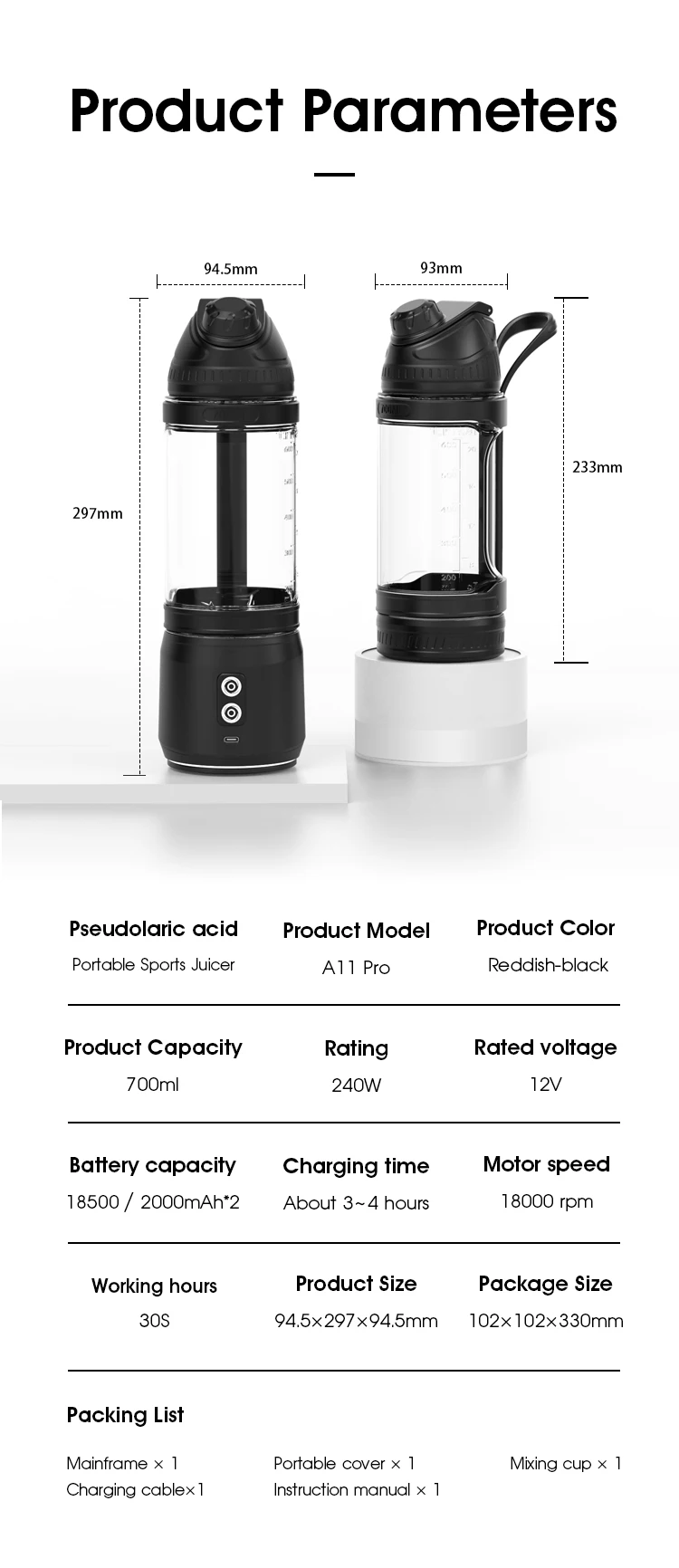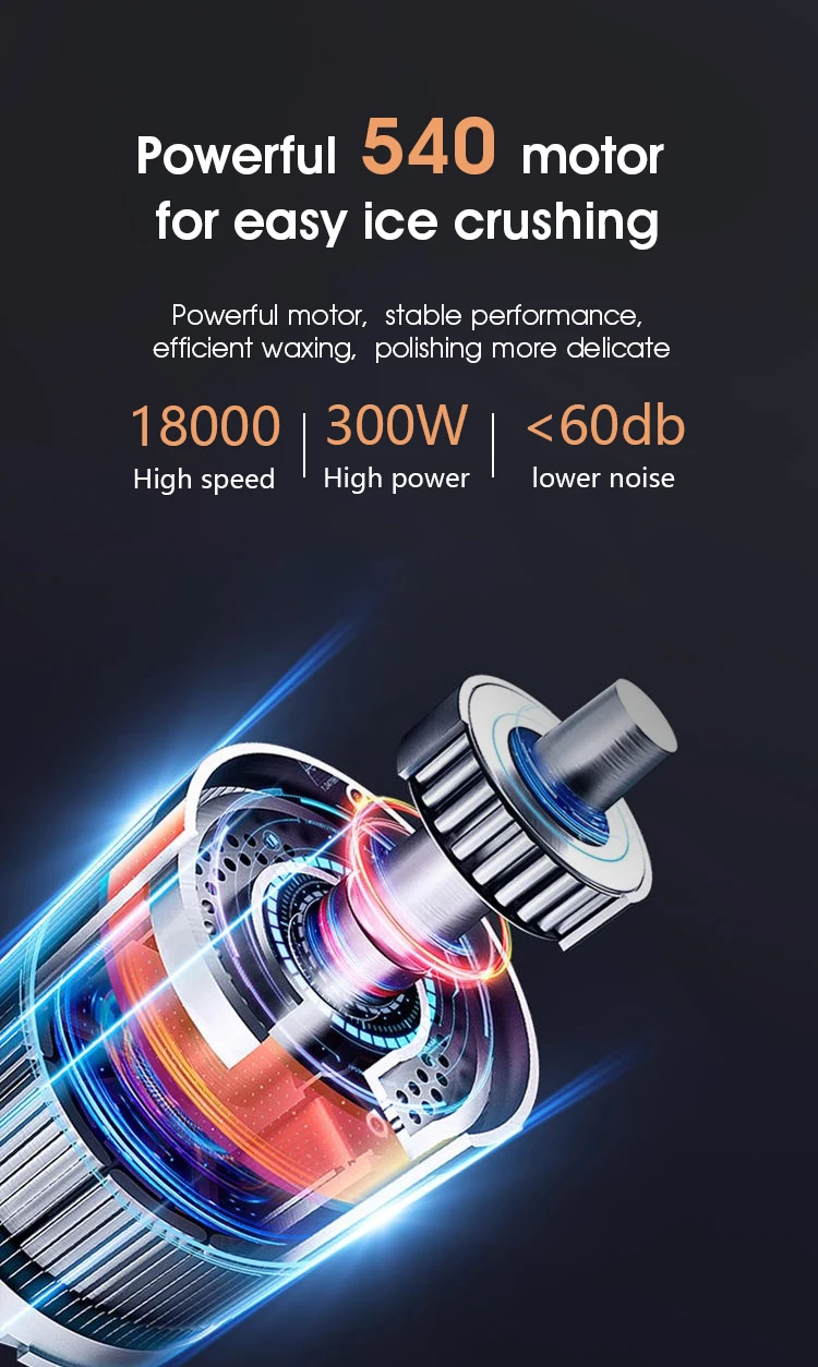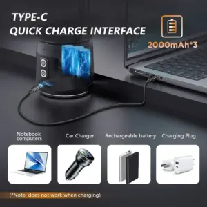 1.Blender built-in 12V voltage 2000mah*3 battery capacity, full power operation for 10~15 times under full battery charge.which has a better range than ordinary portable juicersUse TypeC charging port, design,it can be charged at any time through the convenient power port, such as laptop, desktop, mobile power or car charging port charging, convenient for kitchen, travel, sports, picnic occasions and other uses.