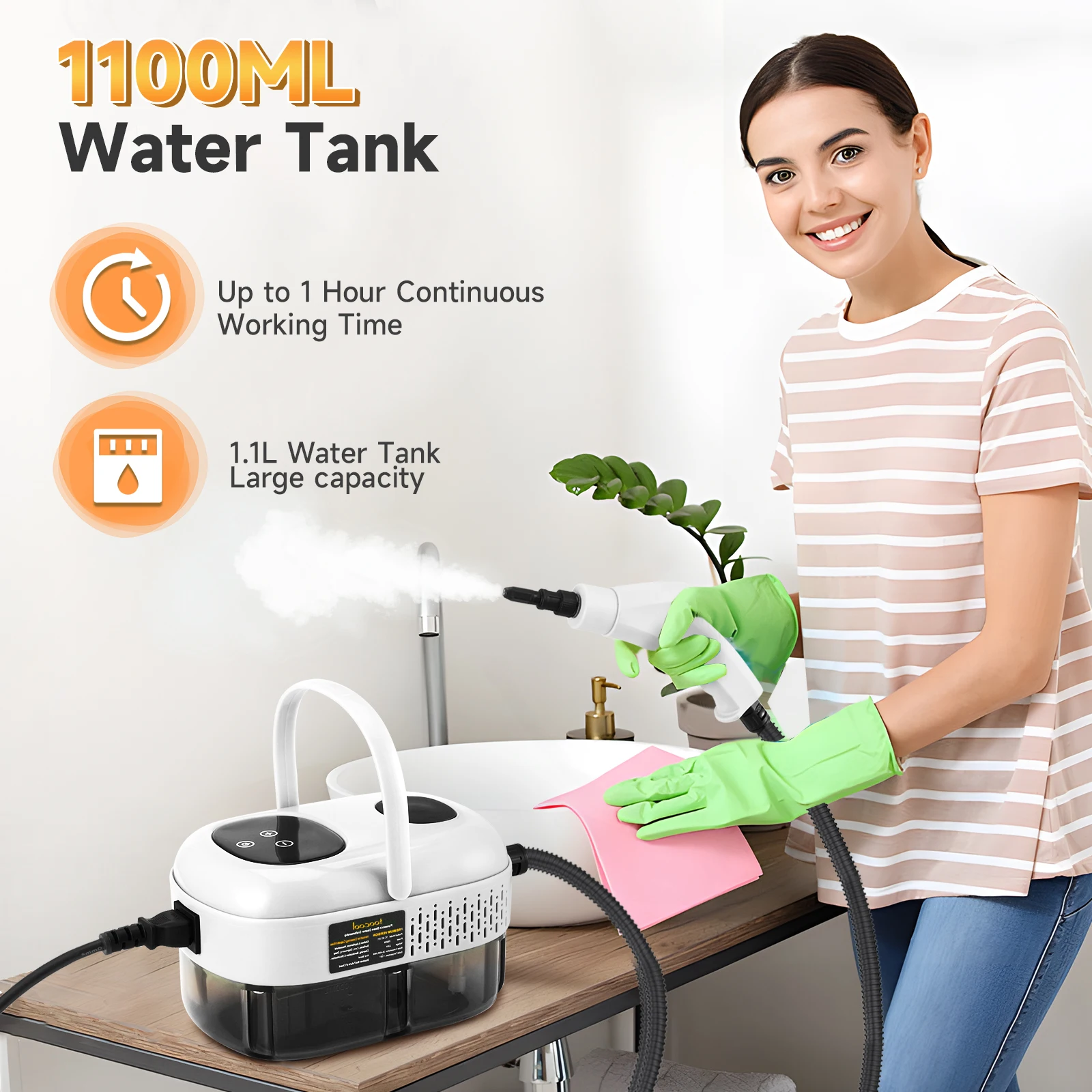 【1100ml Large Water Tank】The portable steam cleaner features 1200ml large capacity water tank which allows you to perform cleaning away from the water source without worrying about refilling, improving your work efficiency. The 6-gear knob allows you to adjust the steam outlet, reach different steam water content and meet your different cleaning needs while saving on water as compared to traditional hand cleaning.