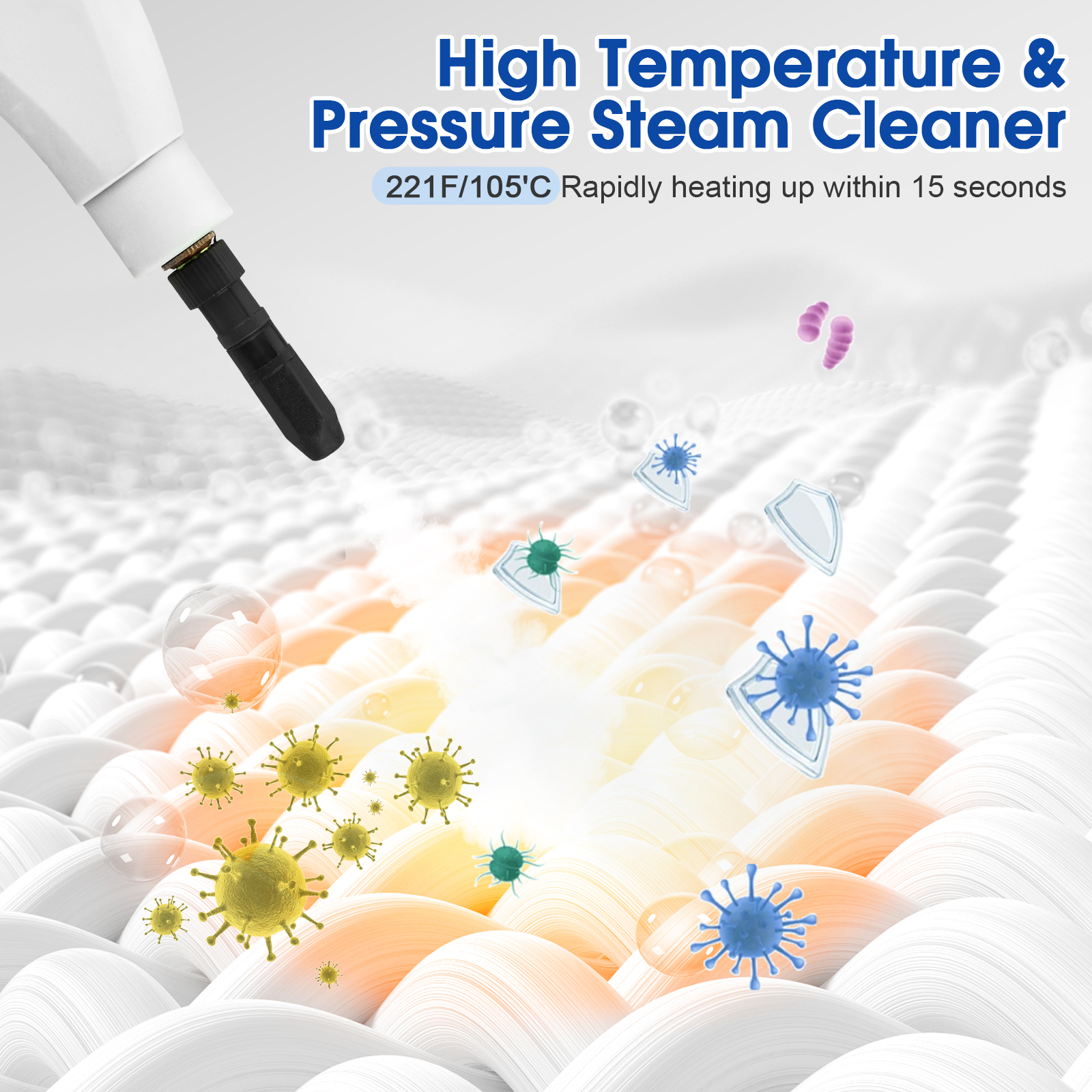 【Powerful Steamer For Cleaning】with 2500W high power, this instant home steam cleaner will be ready in 15 seconds. The steamer generates 221°F/105°C and 3BAR high temperature pressured flow of steam that will deeply clear out stubborn grease, dirt and stains for wide range of items and surfaces to help you create a clean atmosphere around you.