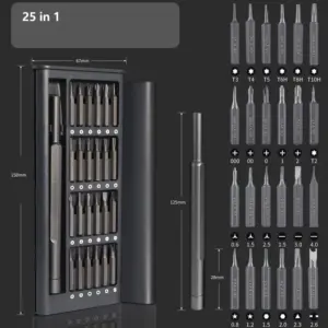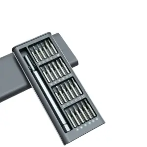 24pcs screw bits and one screwdriver, in an plastic package box with magnetism. Easy to operate, durable and portable.