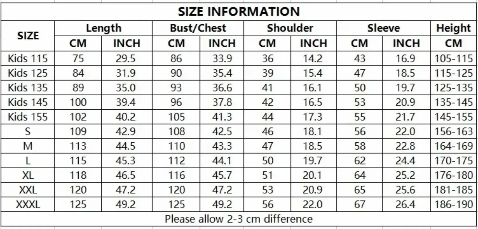 Kids 125 Recomend Heigth:116-125cm Kids 135 Recomend Heigth:126-135cm Kids 145 Recomend Heigth:136-145cm Kids 155 Recomend Heigth:146-155cm