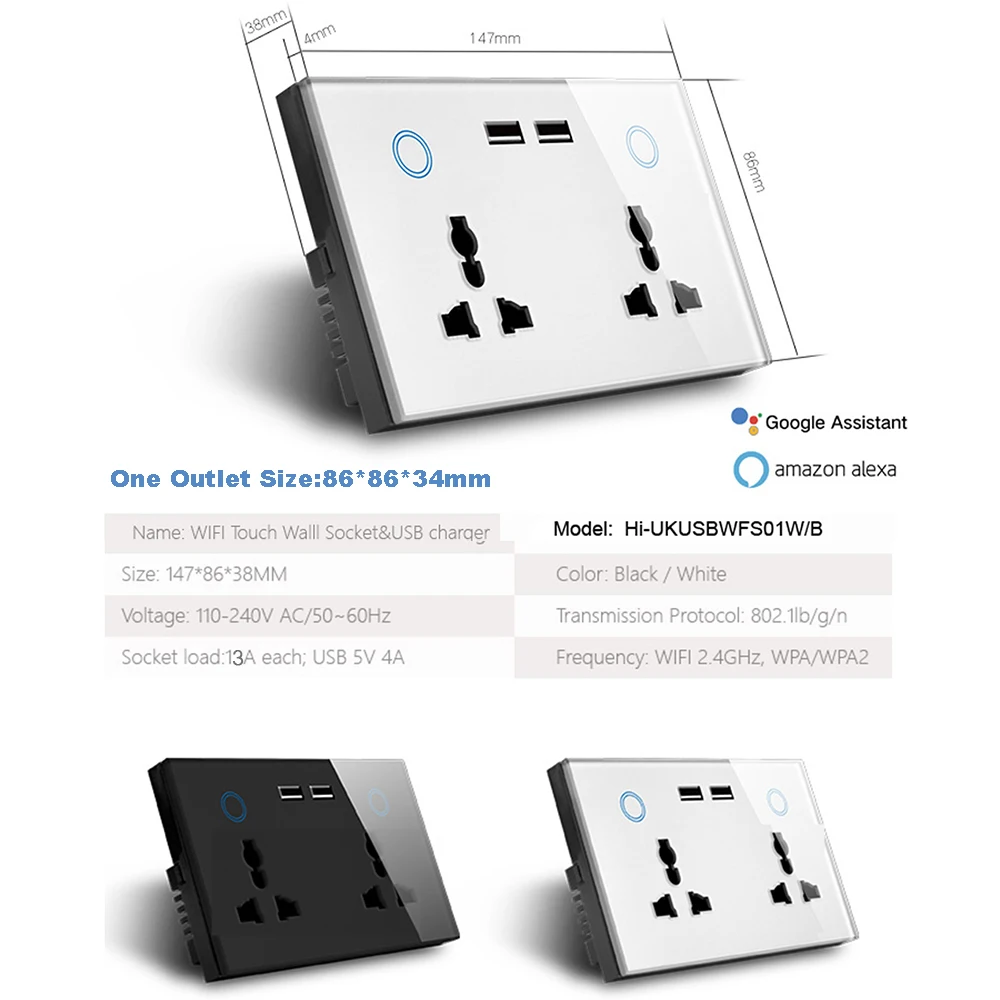 The new SMART Wall Socket is perfectly compatible with Amazon Alexa (Echo and Echo Dot) and Google Home/Assistant, and Nest. Assign a name to the smart socket and activate any device coffee maker, lamp, ac, oven etc.  via voice commands.