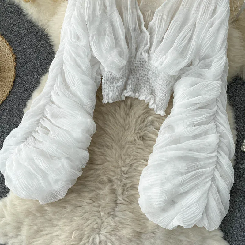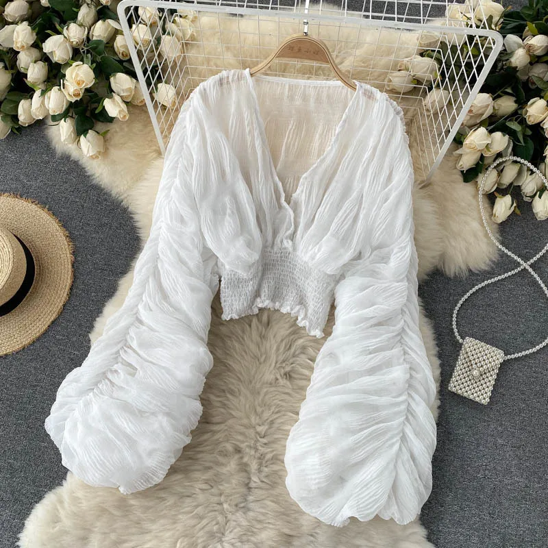Shirt Women Blouse Shirts V Neck Full Puff Sleeve Y2k Tops Sexy Blouses Casual Maxi Ruffles Slim Fit Elegant Splice High Waist