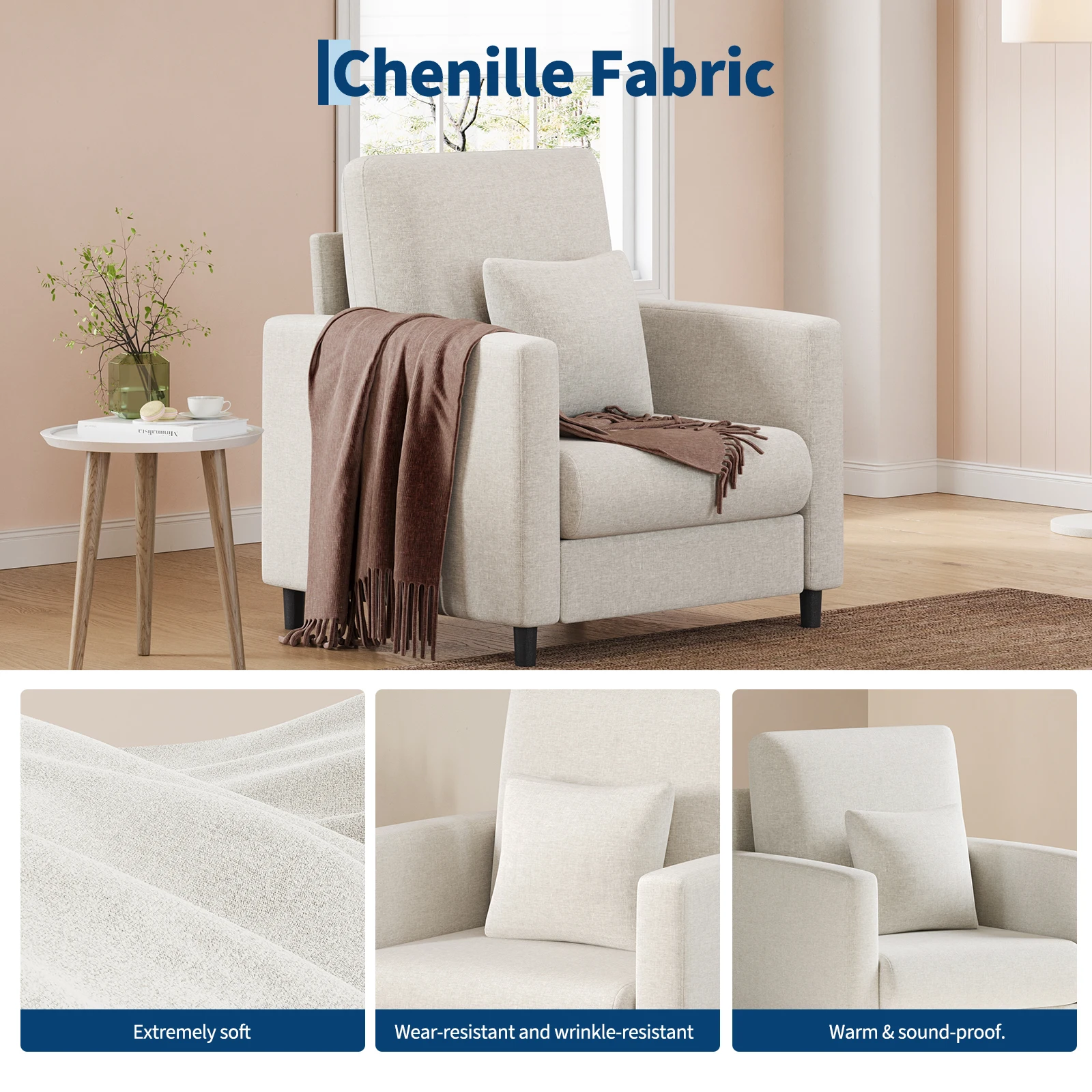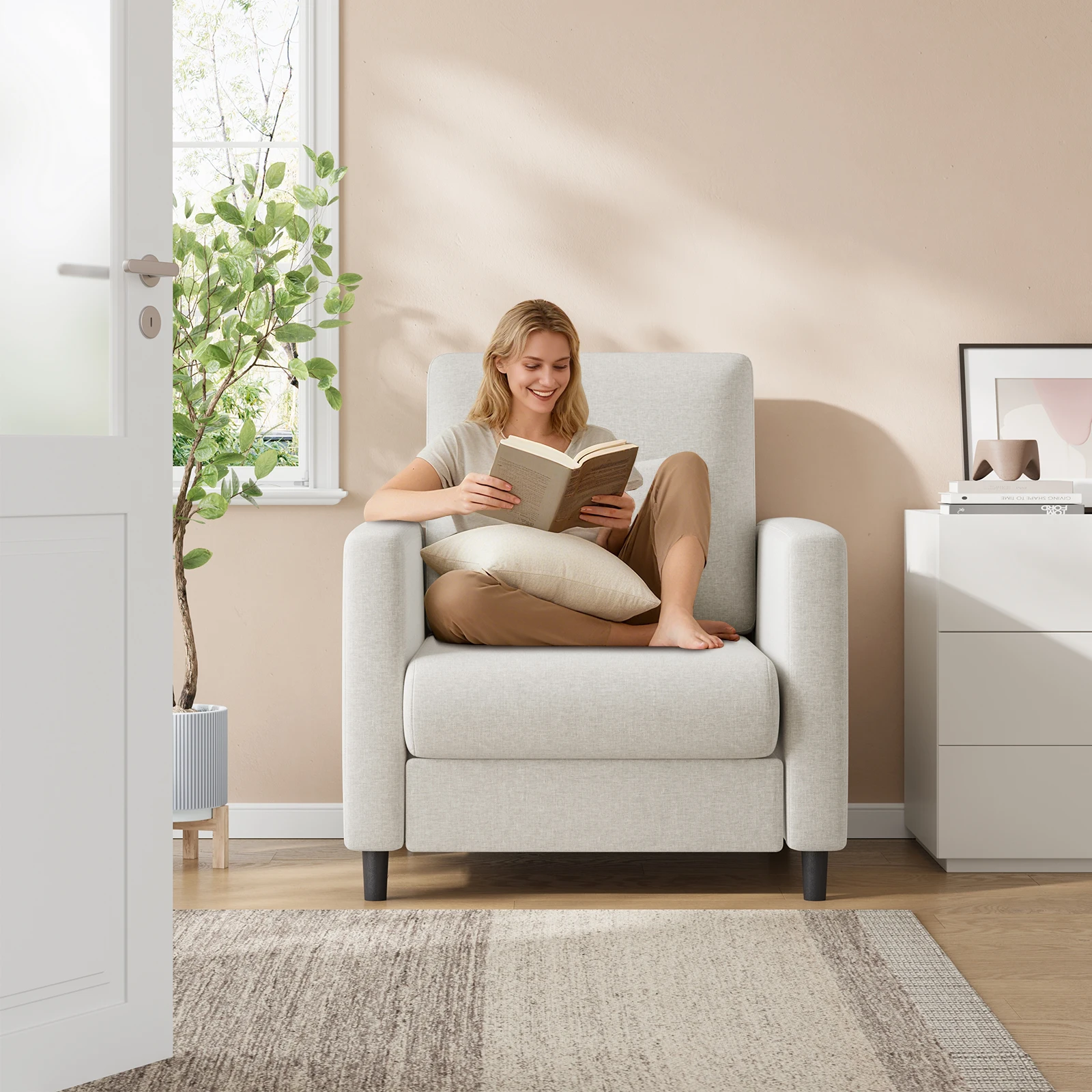 Comfort and Ergonomics: The LALFPET 33″ Beige Sofa Accent Chair offers exceptional comfort with its generously padded seating and contoured backrest that provides excellent lumbar support, making it ideal for long reading sessions or relaxing after a busy day. The supportive armrests enhance overall relaxation and ergonomic comfort.