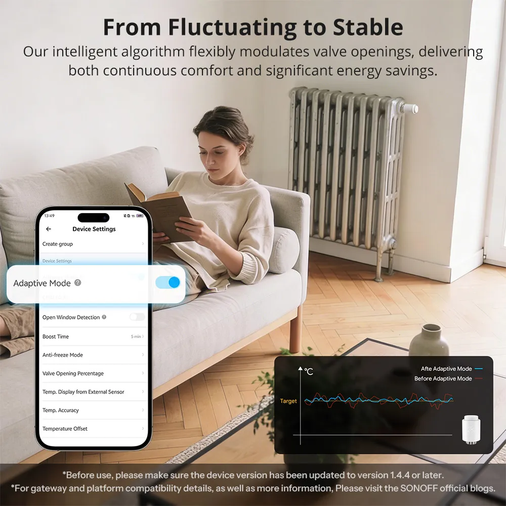 SONOFF Zigbee Thermostats Radiator Valve allows you to control the temperature more precisely with less energy, giving you a more comfortable home. Thermostat Radiator Valve allows App remote control and timing, you can control it anytime, anywhere. Alexa voice control frees your hands. Group control allows control of all radiators with just one tap. It also supports creating smart scenes, such as with SNZB-02P, when the sensor detects the temperature is too low, the thermostat radiator valve adjusts to a comfortable temperature.