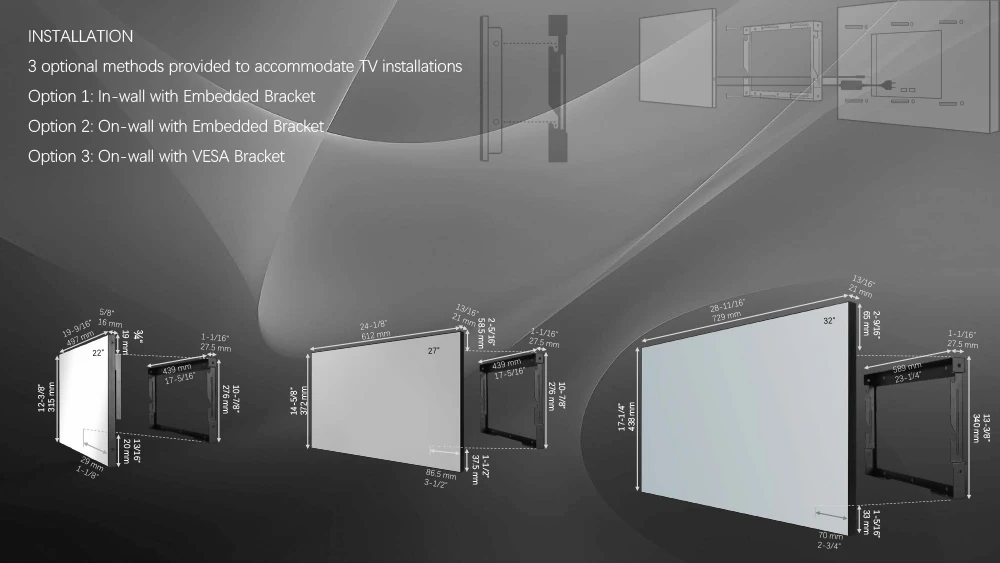 For the models that are designed to be installed and recessed into your wall. It therefore requires a cavity to be cut into your wall, with size of cavity depend on the size of television you purchase. It is recommended that power and input cables are made available adjacent to the cavity opening inside the cavity. This will give you a seamless looking installation.