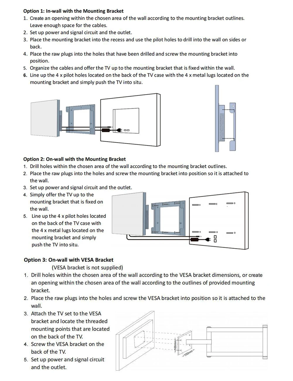 3 optional methods provided to accommodate TV installations