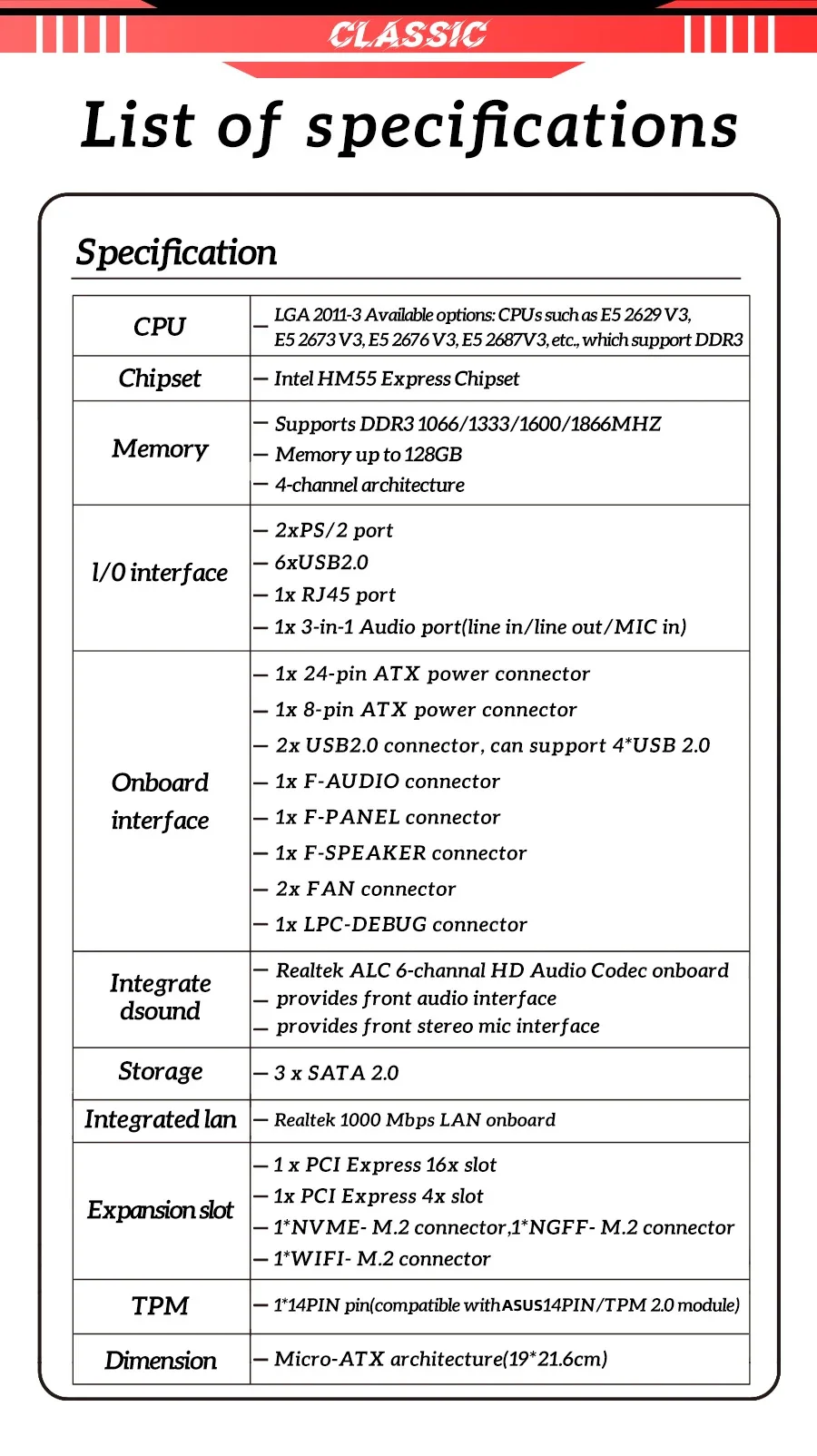 - Onboard Connectors & Header: 24-pin Main Power Connector