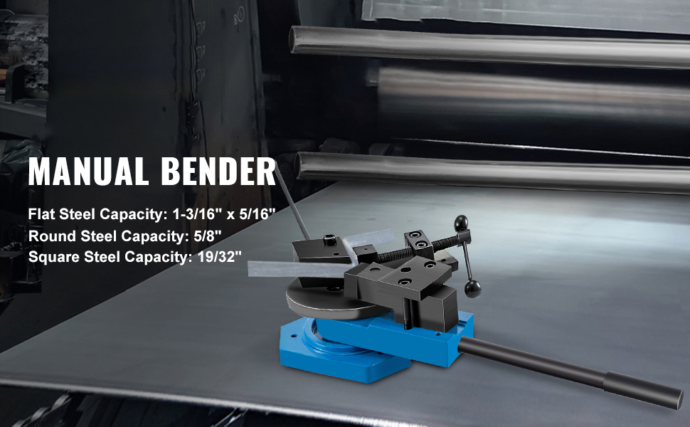Different Shape of Materials: The product is able to bend different metal materials such as steel, wrought iron, brass, copper, aluminum, etc. Max flat steel size: 1-3/16″ x 5/16″(30 x 8 mm), max round steel size: 5/8″ (15.8 mm) , max square steel size: 19/32″ (15 mm).