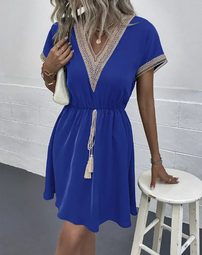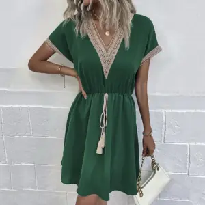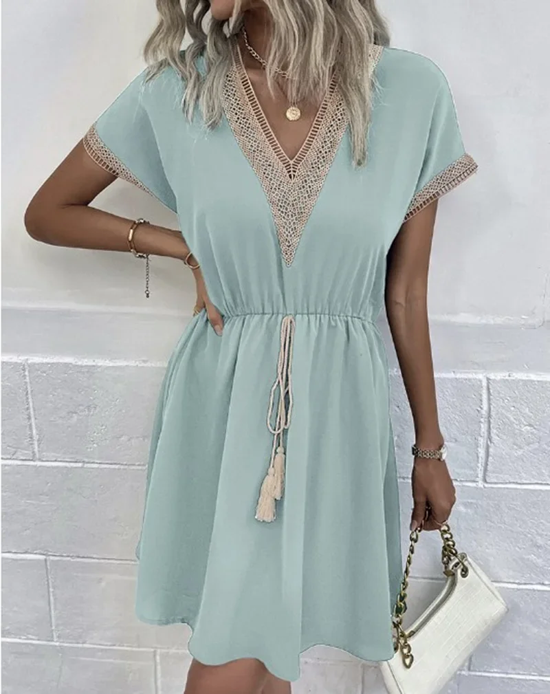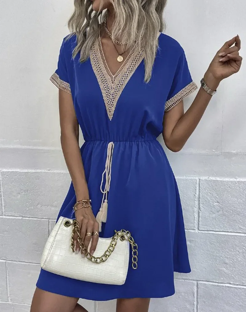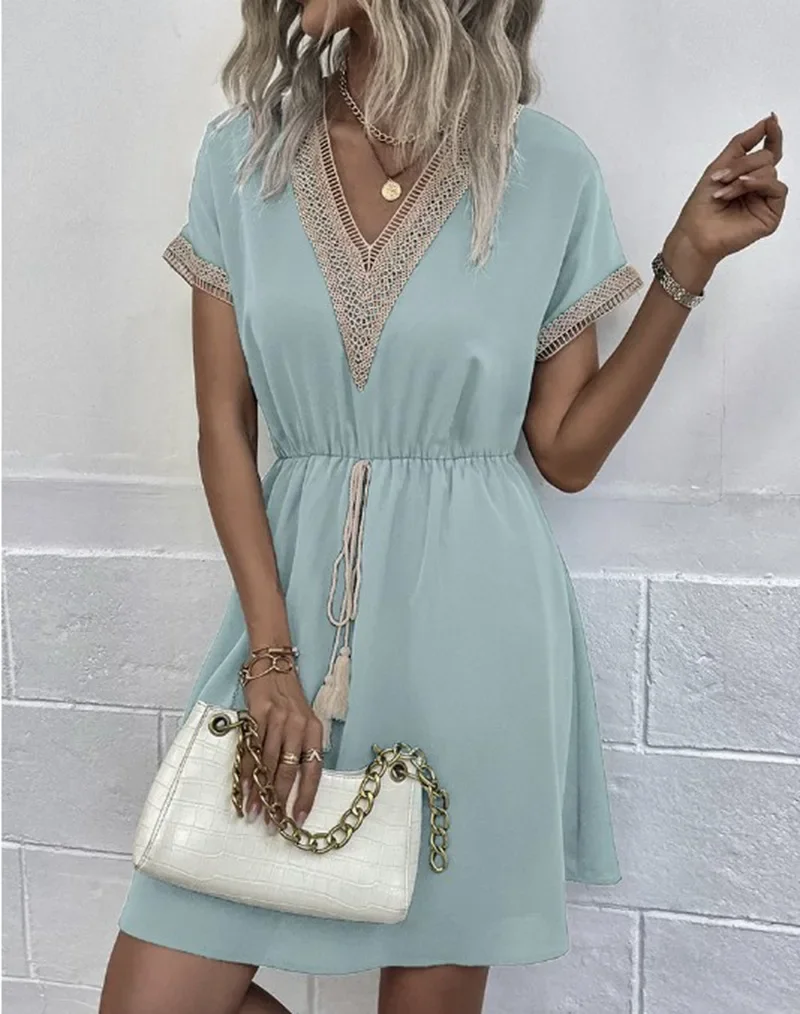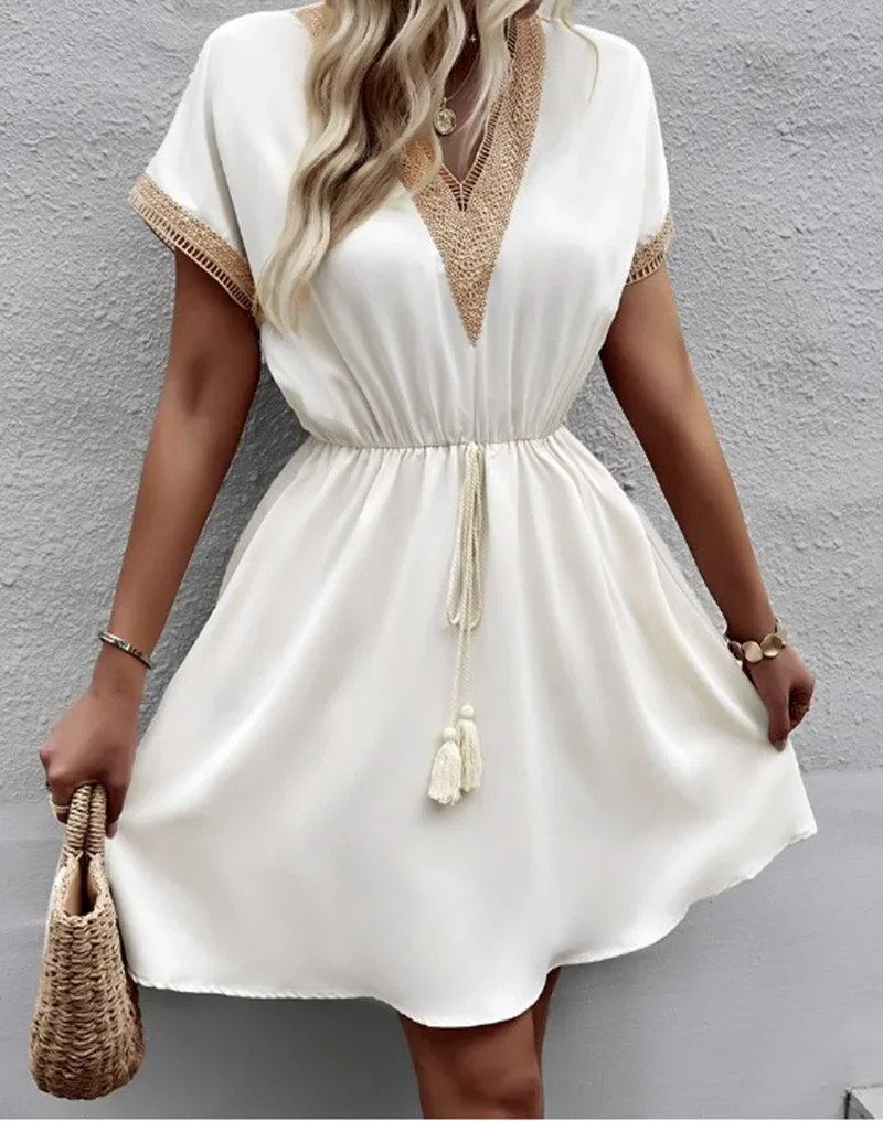 1 review for Summer Solid Short Sleeve Lace V Neck Waistband Female Beach Midi Short Dress Elegant Women’s Sweet White Solid Color Dresses