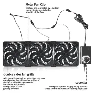 The fans are connected by a custom metal clipsto maintain the stability of the fans