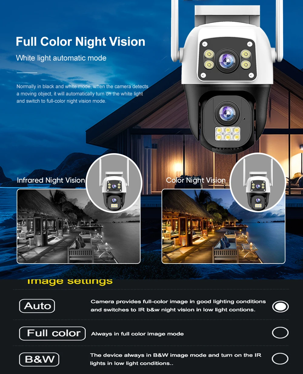 (Infrared night vision is released when no object moves, and the white light will be turned on to switch to full-color mode after motion is detected).