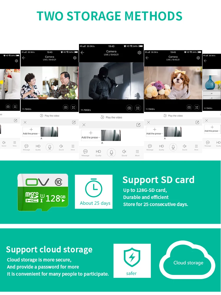 capture, APP manual video recording, video playback, cloud storage, intercom, offline reminder, image flip, time watermark, etc