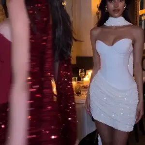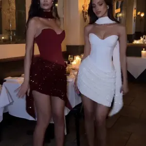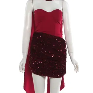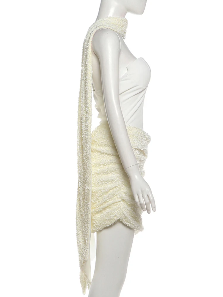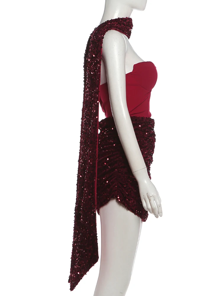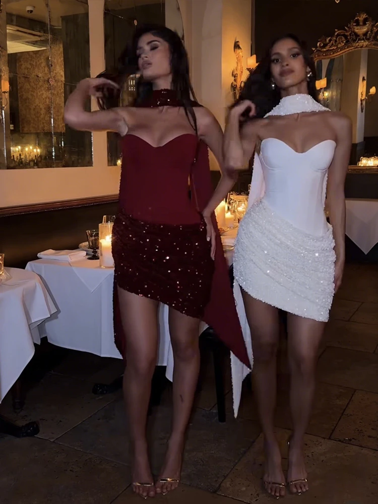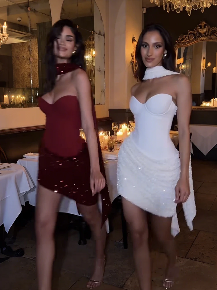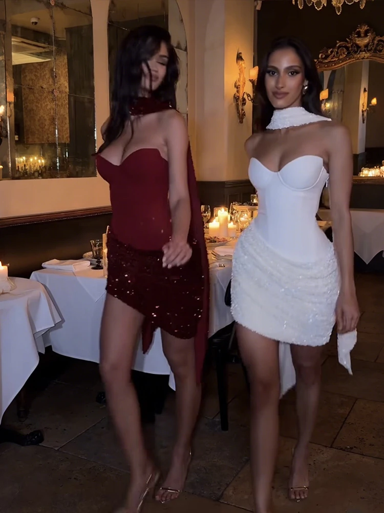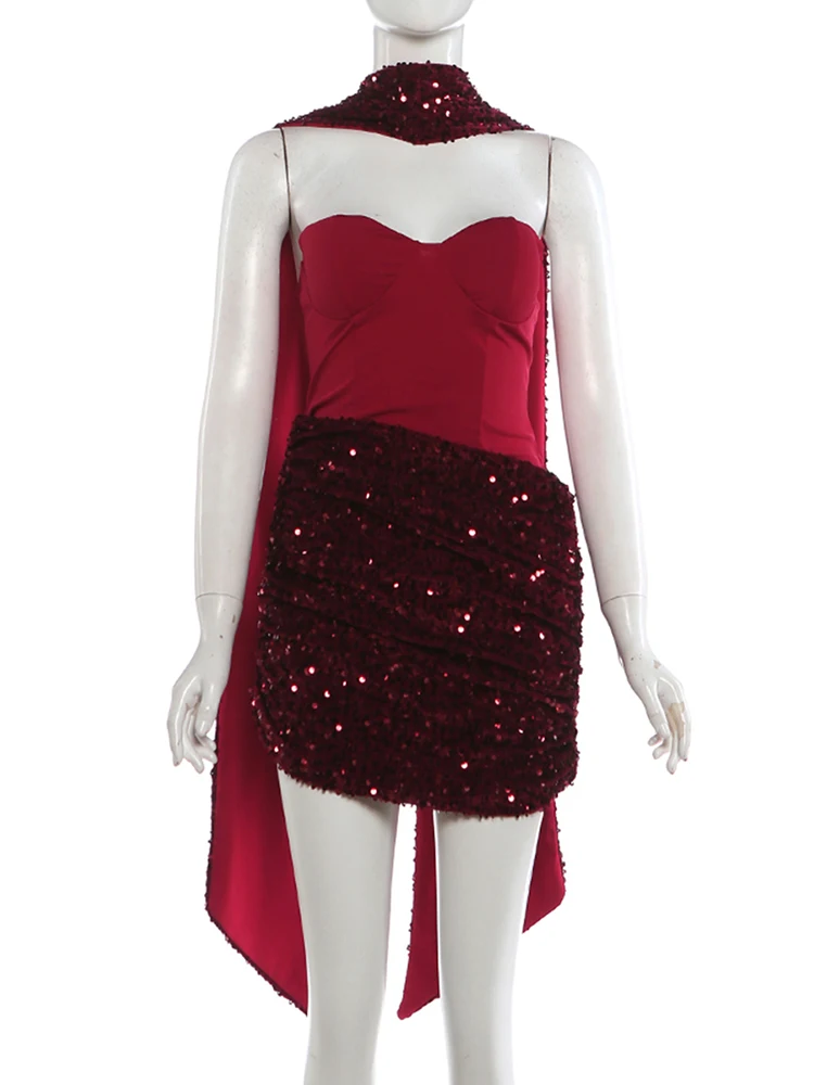Weird Puss Sexy Women Dress+Scarf Valentine’s Day Banquet Strapless Sequins Patchwork Ruched Peach Hip Birthday Party Bodycon