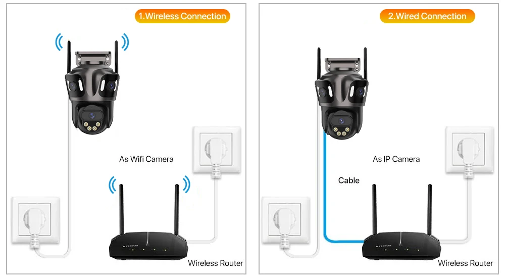 – You could select the convenient connection as you want . Sometimes you might just have one way to connect the camera , don’t worry , this camera supports wireless and wired connection at the same time.