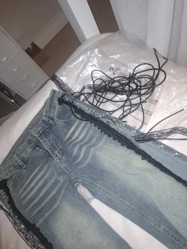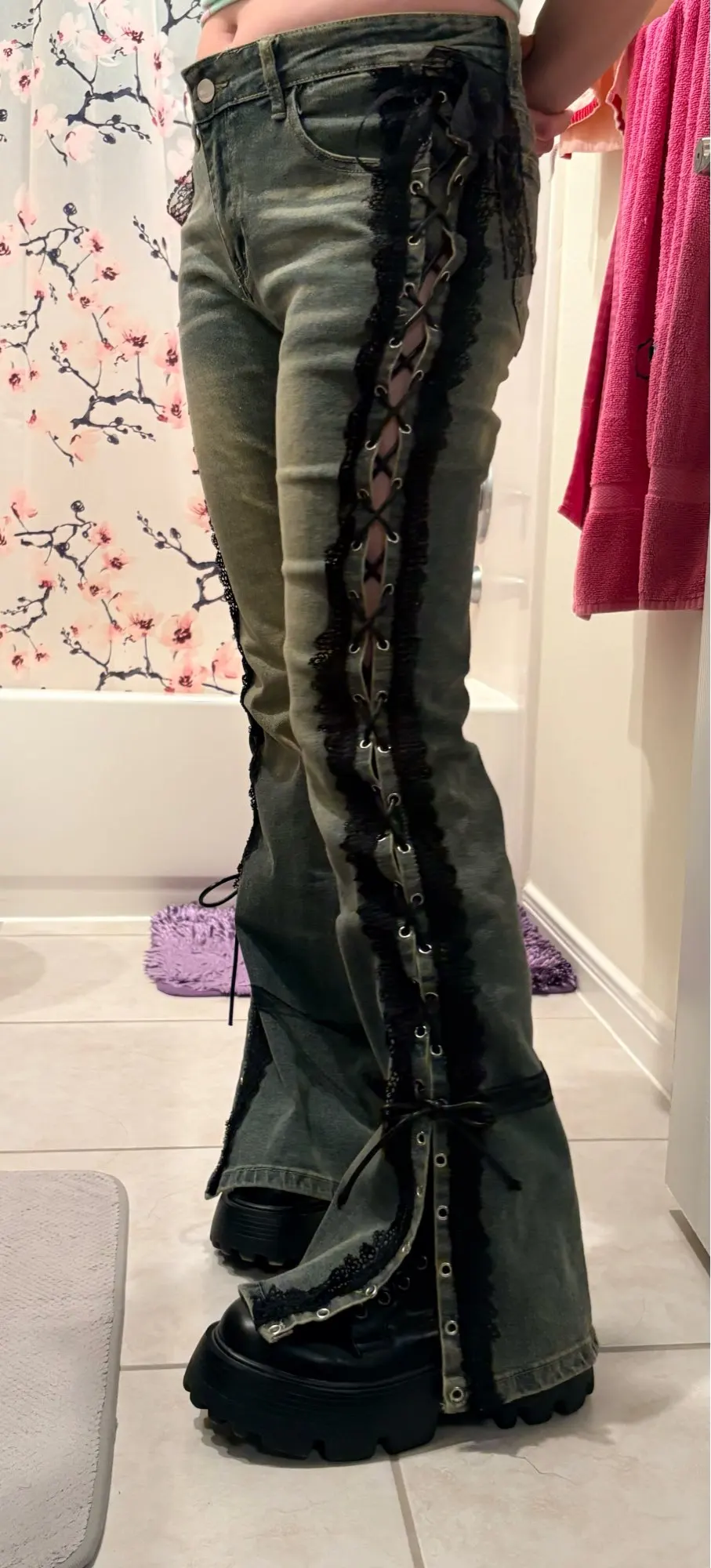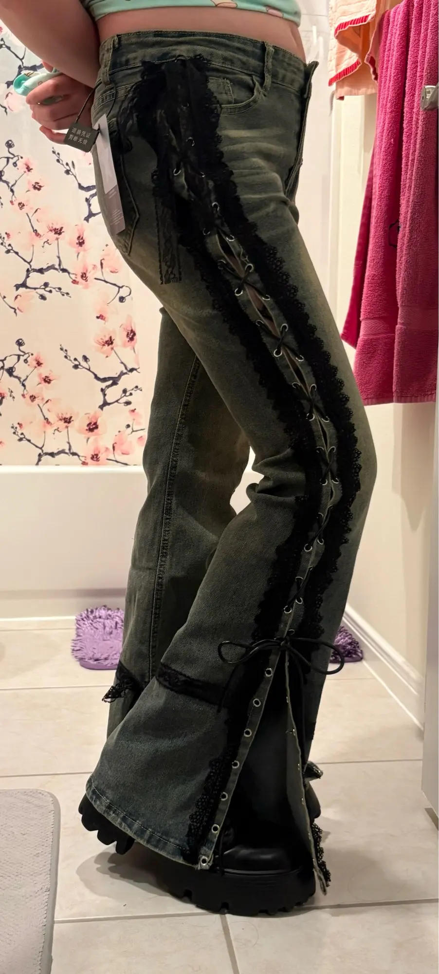 1. Women Dark Academia Goblin Core Harajuku Y2K Low Rise Lace Jeans Abi Denim Flare Pants Bell-Bottom Y2k Japanese Goth Gyaru Kpop photo review