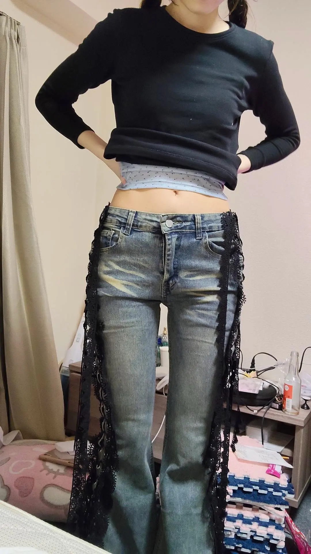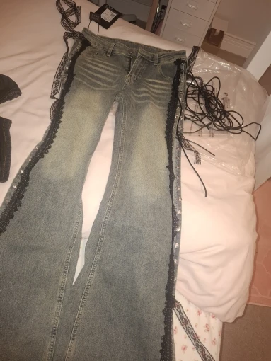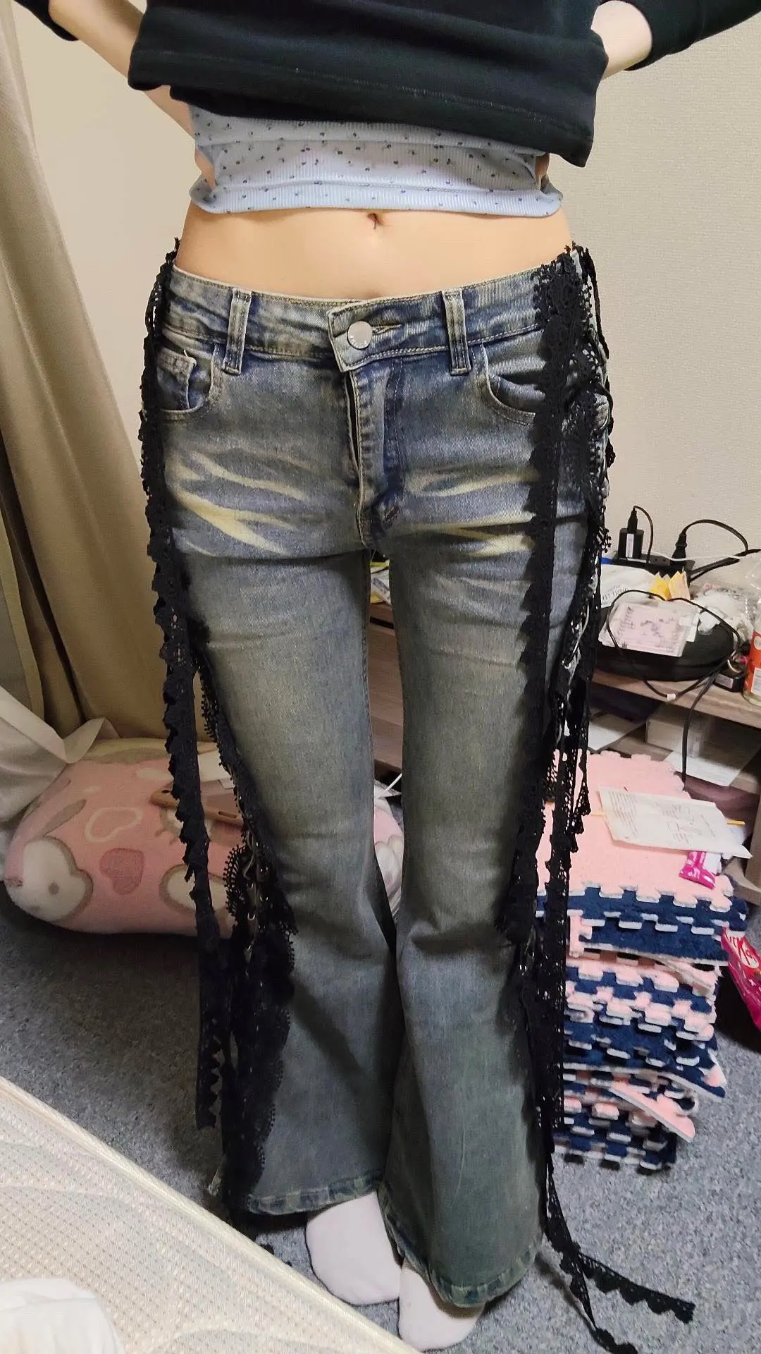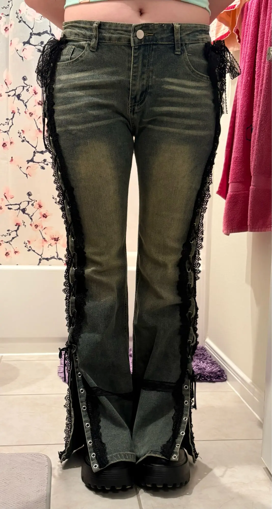 1. Women Dark Academia Goblin Core Harajuku Y2K Low Rise Lace Jeans Abi Denim Flare Pants Bell-Bottom Y2k Japanese Goth Gyaru Kpop photo review