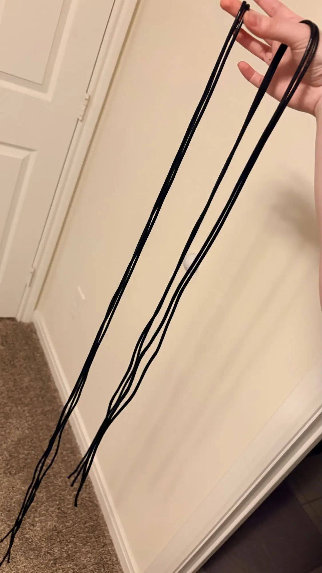 Arrived fast. Cute jeans! They are long so i had to wear my platform boots. There is 4 pairs of string to lace up your jeans (2 long and 2 short). It took awhile to lace up the pants. I used both the long strings and start from the top and it stops mid-calf area where the pants legs open up the way i like it. The black lace can be tied at both sides of the hip area and both sides at the mid-calf area. I had to burn the edges of the strings so i could put it through the grommets but they came apart a bit (put a piece of plastic on them like your shoelaces so they don’t come apart).