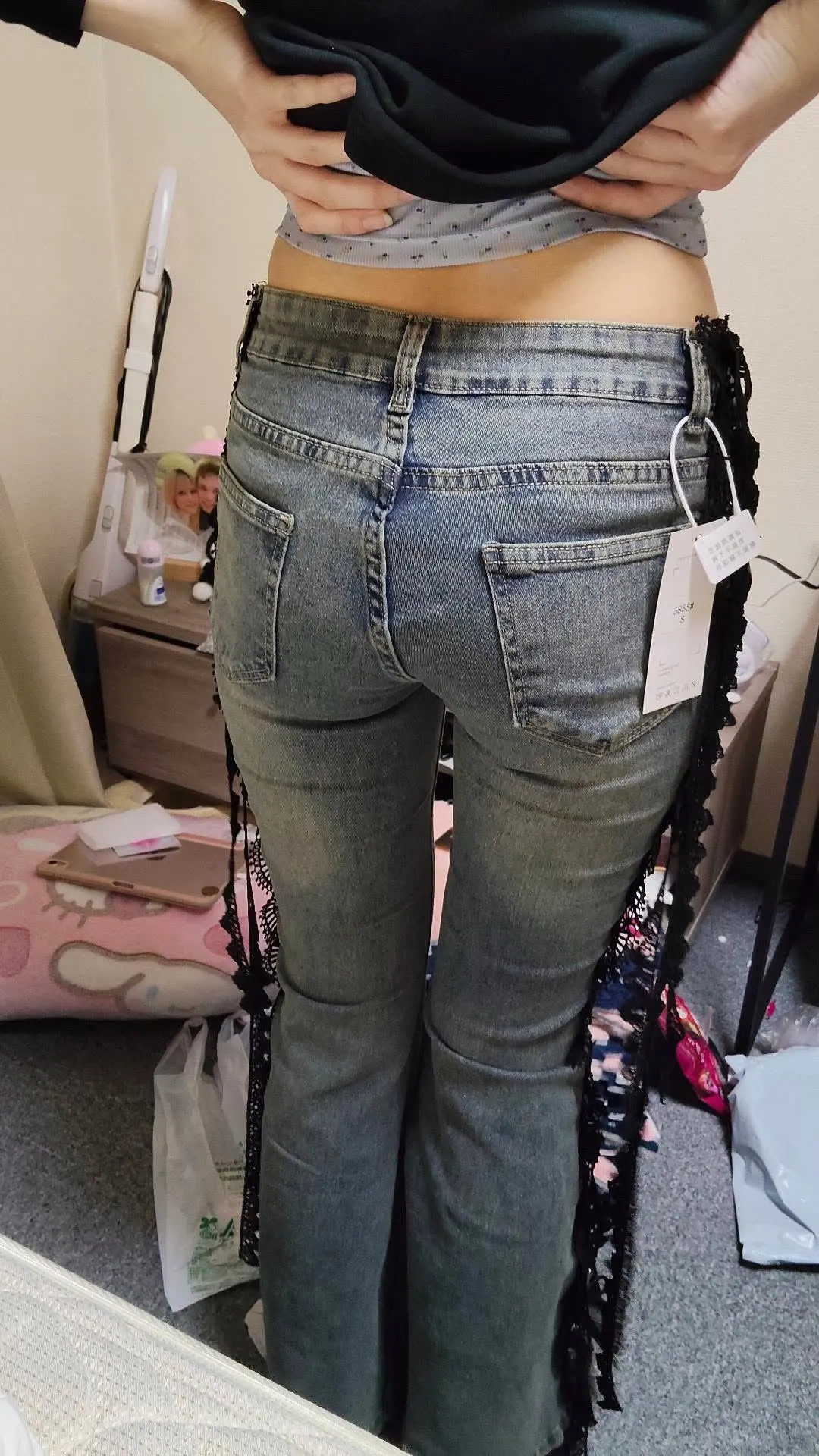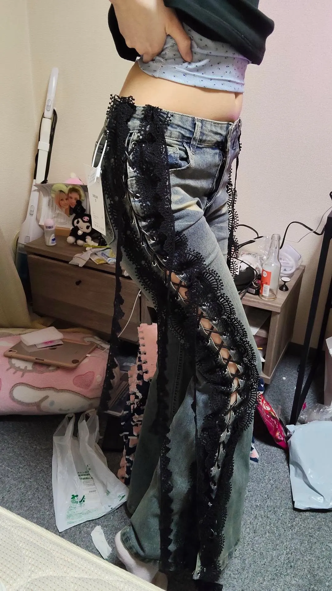 Women Dark Academia Goblin Core Harajuku Y2K Low Rise Lace Jeans Abi Denim Flare Pants Bell-Bottom Y2k Japanese Goth Gyaru Kpop photo review