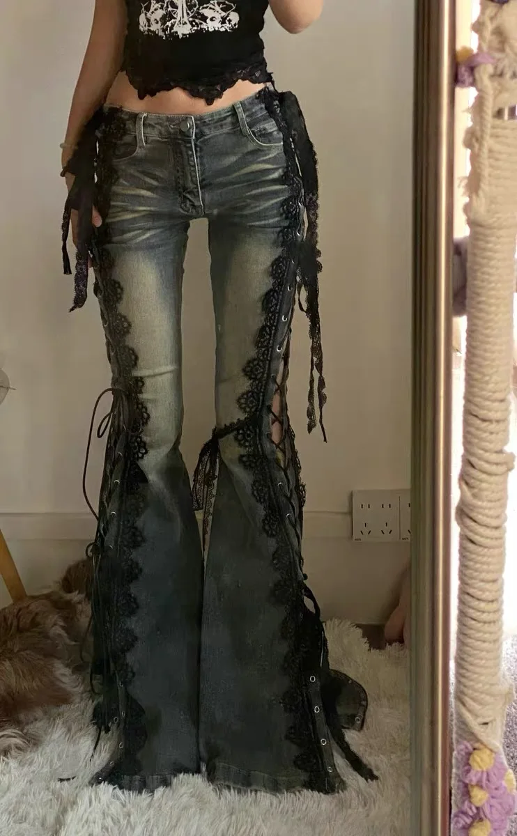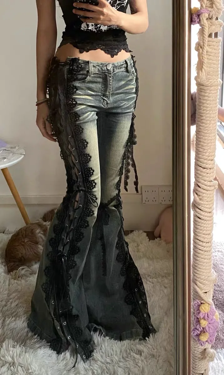 Women Dark Academia Goblin Core Harajuku Y2K Low Rise Lace Jeans Abi Denim Flare Pants Bell-Bottom Y2k Japanese Goth Gyaru Kpop