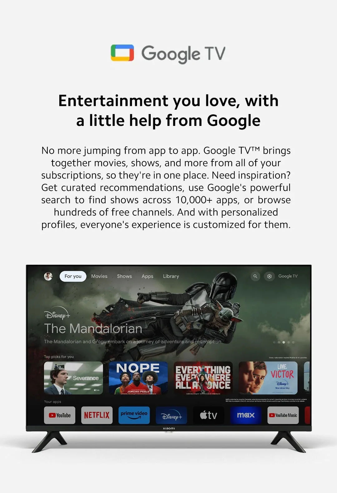 【Google System】Google TV™2,Google Assistant built-in3, Google Play 2 access, Smart home control hub, Chromecast built-in™4 and Miracast,Netflix, Prime Video and YouTube pre-installed.