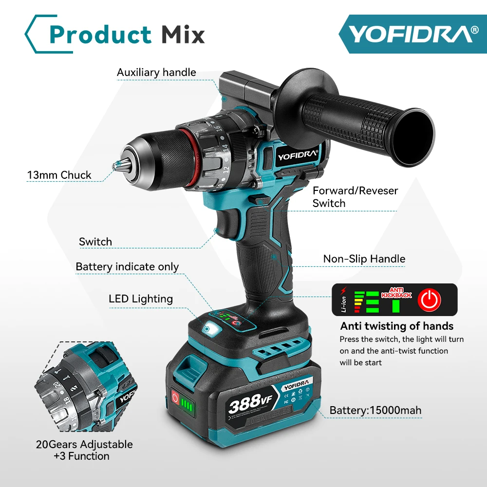 YOFIDRA 700N.m 13mm Brushless Electric Drill Multifunction Home DIY Ice Breaking Power Tools For 18V Battery