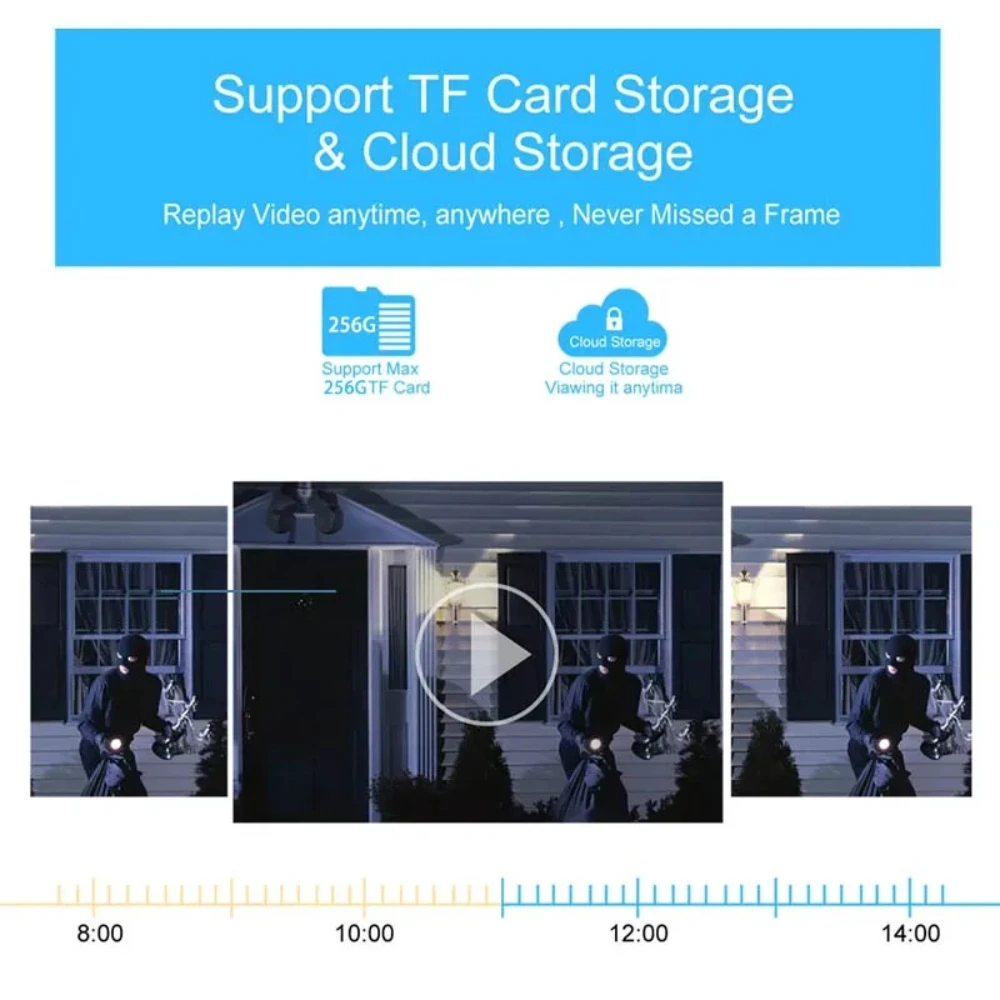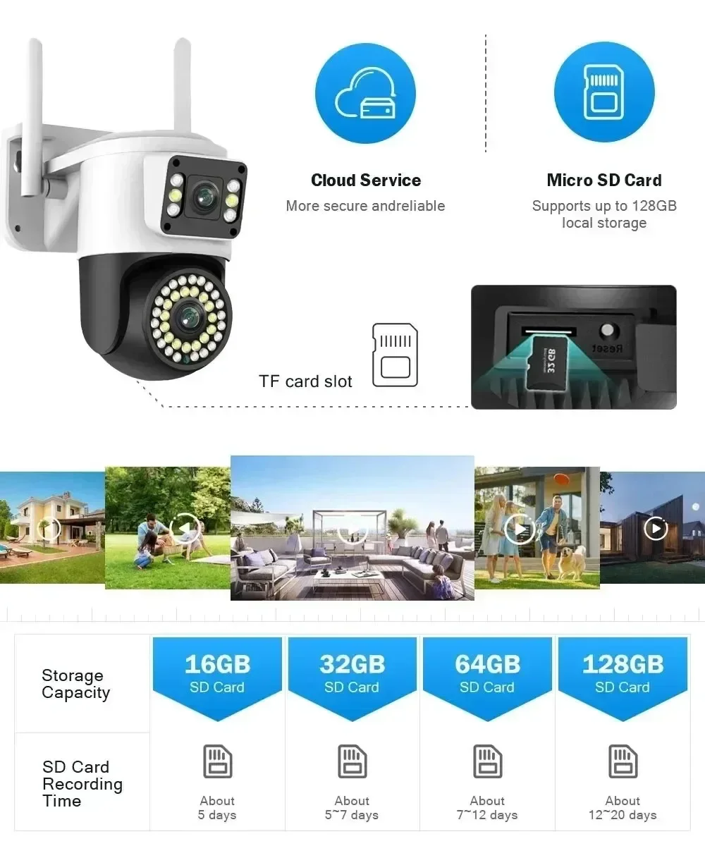 The camera supports up to 256GB TF card local backup and also provides cloud storage service(Need to pay extra cost)