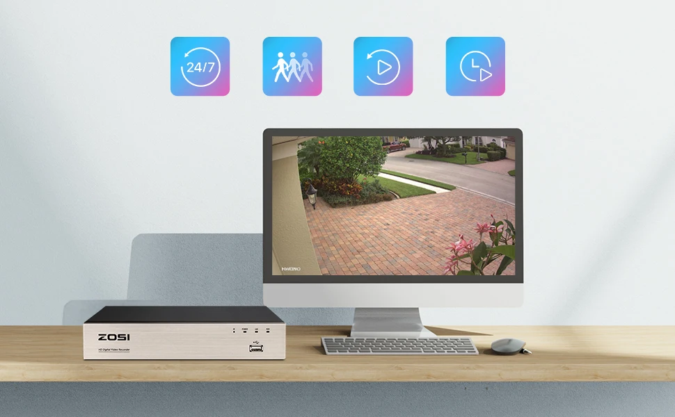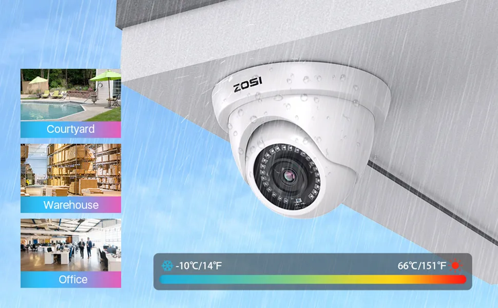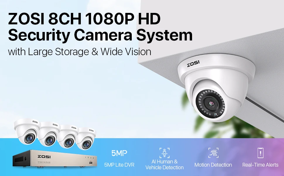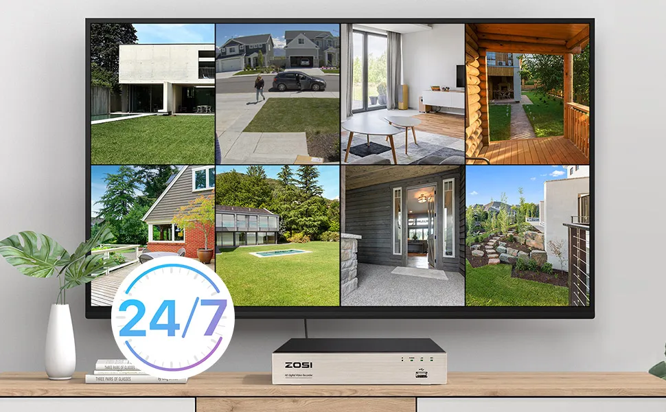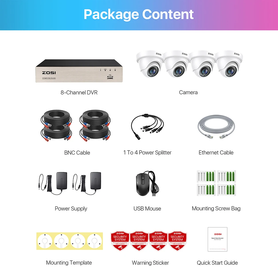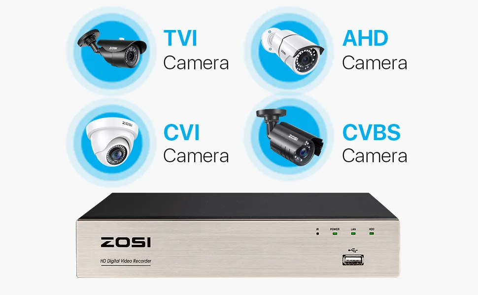 It supports up to 8 HD- TVI/CVI/ AHD/ CVBS security cameras. (ZOSI’s bullet camera and dome camera are both compatible)