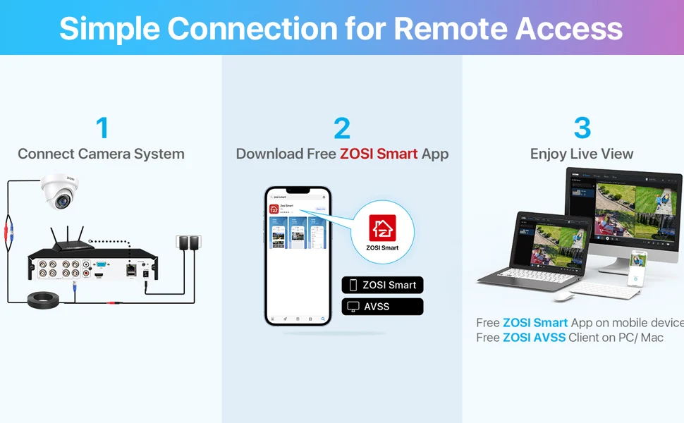 Local Viewing: No Network needed, just connect the system to a monitor via HDMI/VGA port. Remote Viewing: Download the Zosi Smart app on your smartphone (iOS or Android), and enjoy four cameras simultaneous viewing on the app.You could also view the live view on computer via AVSS PC client.