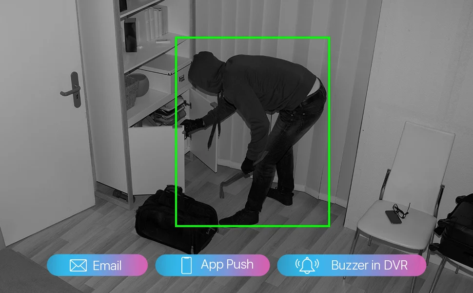 You will be alerted by emails, App push notifications and buzzer alarms when motions are detected.